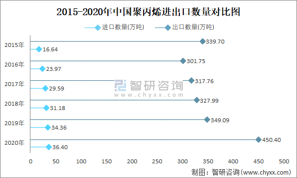 2015-2020年中國聚丙烯進出口數(shù)量對比統(tǒng)計圖