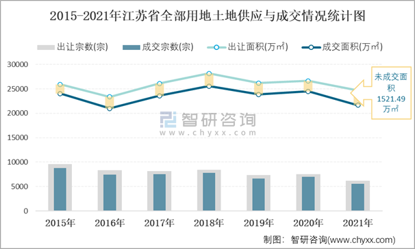 2015-2021年江蘇省全部用地土地供應(yīng)與成交情況統(tǒng)計圖