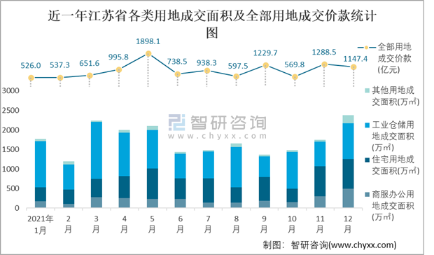 近一年江蘇省各類用地成交面積及全部用地成交價款統(tǒng)計圖