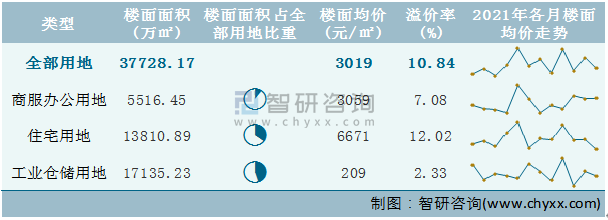 根據(jù)國信房地產(chǎn)信息網(wǎng)數(shù)據(jù)統(tǒng)計可知:2021年12月江蘇省全部用地出讓地面均價為3981元/㎡,其中住宅用地出讓地面均價最高(7761元/㎡),全部用地成交地面均價為4813元/㎡,其中住宅用地成交地面均價為9563元/㎡,高于商服辦公用地成交地面均價;2021年1-12月江蘇省工業(yè)倉儲用地樓面面積占其全部用地比重最多,為45.42%,溢價率為2.33%。