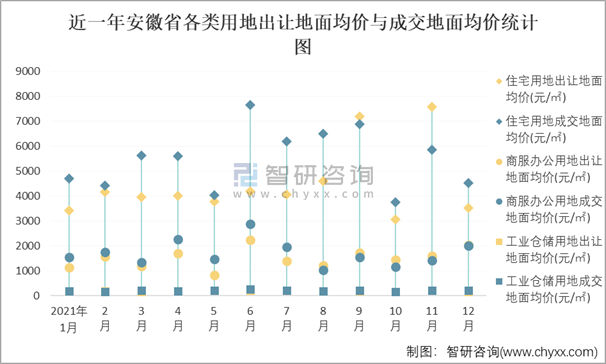 近一年安徽省各類用地出讓地面均價與成交地面均價統(tǒng)計圖