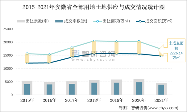 2015-2021年安徽省全部用地土地供應(yīng)與成交情況統(tǒng)計圖
