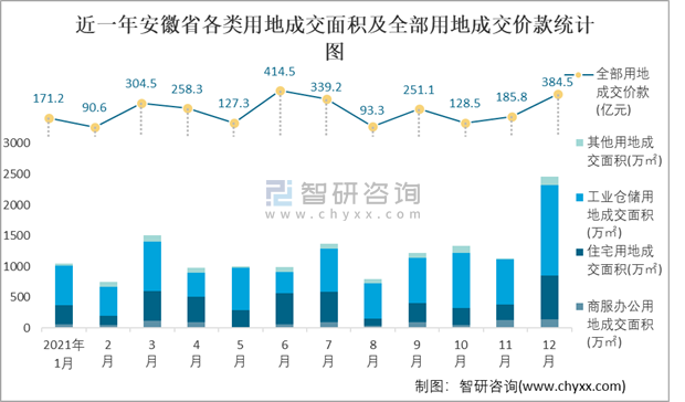 近一年安徽省各類用地成交面積及全部用地成交價款統(tǒng)計圖