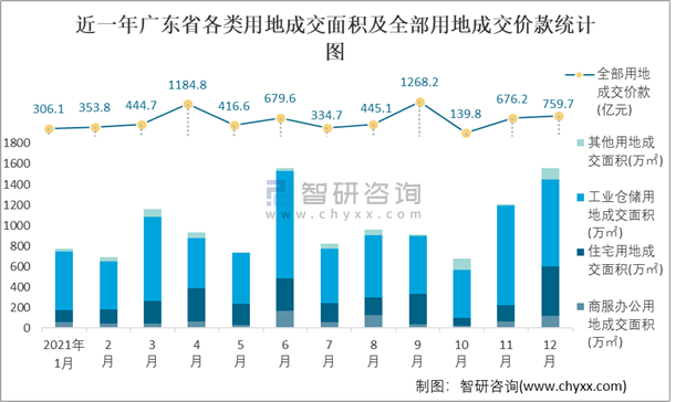 近一年廣東省各類用地成交面積及全部用地成交價款統計圖