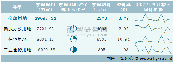 根據國信房地產信息網數據統計可知:2021年12月廣東省全部用地出讓地面均價為3023元/㎡,其中住宅用地出讓地面均價最高(5499元/㎡),全部用地成交地面均價為4885元/㎡,其中住宅用地成交地面均價為12243元/㎡,高于商服辦公用地成交地面均價;2021年1-12月廣東省工業倉儲用地樓面面積占其全部用地比重最多,為61.35%,溢價率為1.93%。