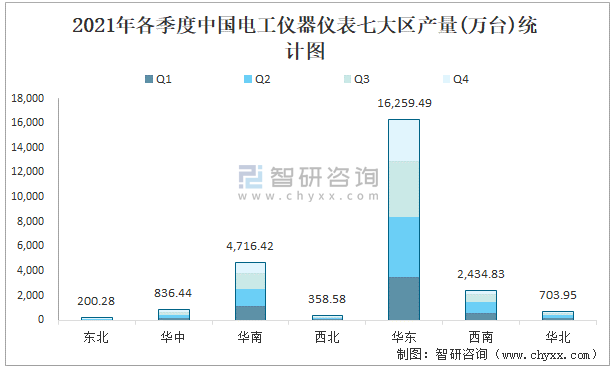 2021年各季度中國電工儀器儀表七大區產量統計圖