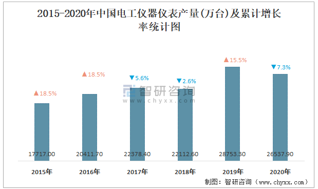 2015-2020年中國電工儀器儀表產量及累計增長率統計圖