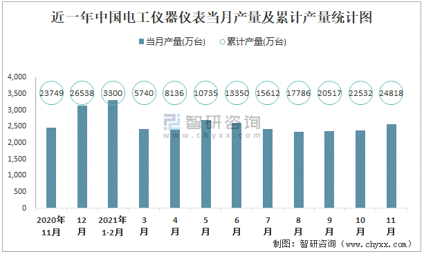 近一年中國電工儀器儀表當月產量及累計產量統計圖