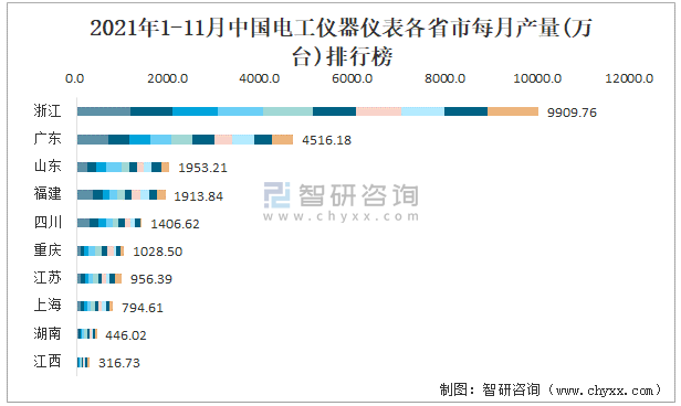 2021年1-11月中國電工儀器儀表各省市每月產量排行榜