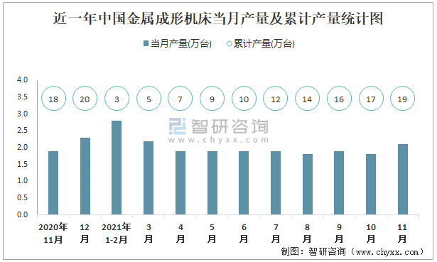 根據(jù)國家統(tǒng)計(jì)局?jǐn)?shù)據(jù)顯示:2021年11月中國金屬成形機(jī)床產(chǎn)量為2.1萬臺,同比增長0%;2021年1-11月中國金屬成形機(jī)床累計(jì)產(chǎn)量為19.3萬臺,累計(jì)增長3.8%;2015-2020年中國金屬成形機(jī)床產(chǎn)量2016年達(dá)到最高,此后總體呈現(xiàn)下降趨勢。