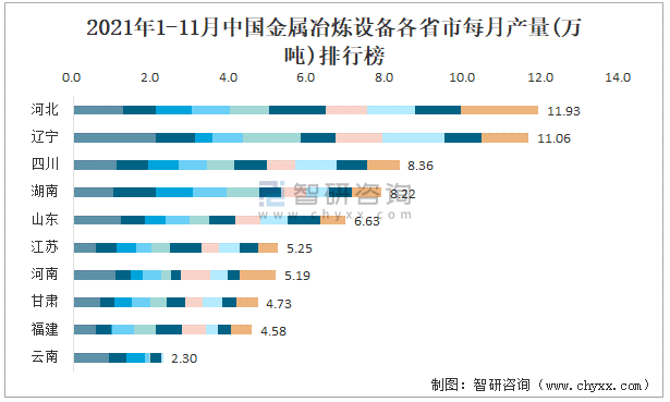 2021年1-11月中國金屬冶煉設備各省市每月產量排行榜