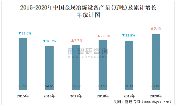 2015-2020年中國金屬冶煉設備產量及累計增長率統計圖