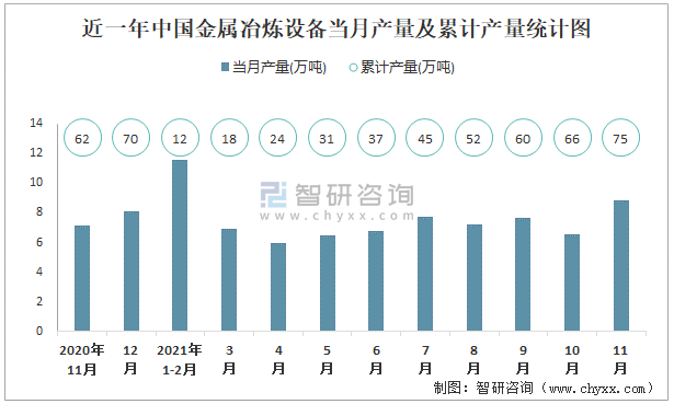 根據國家統計局數據顯示:2021年11月中國金屬冶煉設備產量為8.8萬噸,同比增長13.7%;2021年1-11月中國金屬冶煉設備累計產量為74.7萬噸,累計增長16%;2015-2020年中國金屬冶煉設備產量近兩年呈上升趨勢。