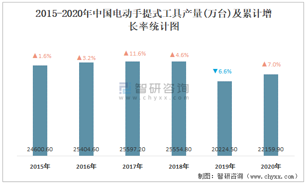 2015-2020年中國電動手提式工具產量及累計增長率統計圖