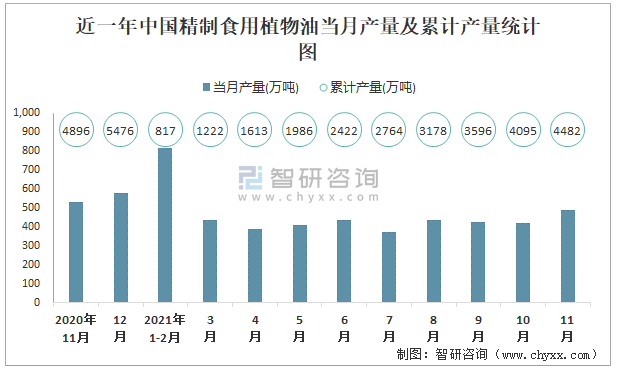 近一年中國精制食用植物油當月產量及累計產量統計圖