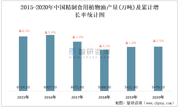 2015-2020年中國精制食用植物油產量及累計增長率統計圖