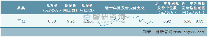 根據(jù)農(nóng)村農(nóng)業(yè)部數(shù)據(jù)統(tǒng)計(jì)可知:2022年第3周全國(guó)平菇平均批發(fā)價(jià)為6.58元/公斤,同比下跌9.24%,環(huán)比下跌1.2%,近一年全國(guó)平菇平均批發(fā)價(jià)最高達(dá)到8.43元/公斤,批發(fā)價(jià)最低也要5.58元/公斤。