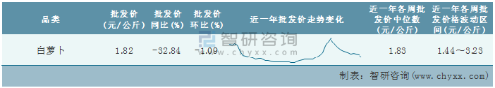 根據農村農業部數據統計可知:2022年第3周全國白蘿卜平均批發價為1.82元/公斤,同比下跌32.84%,環比下跌1.09%,近一年全國白蘿卜平均批發價最高達到3.23元/公斤,批發價最低也要1.44元/公斤。