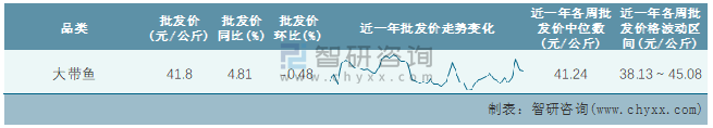2022年第3周(2022年1月10日-1月16日)全國大帶魚平均批發價分析:本周批發價為41.8元/公斤,同比增加4.81%