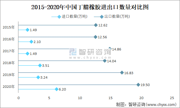 2015-2020年中國丁腈橡膠進(jìn)出口數(shù)量對比統(tǒng)計(jì)圖