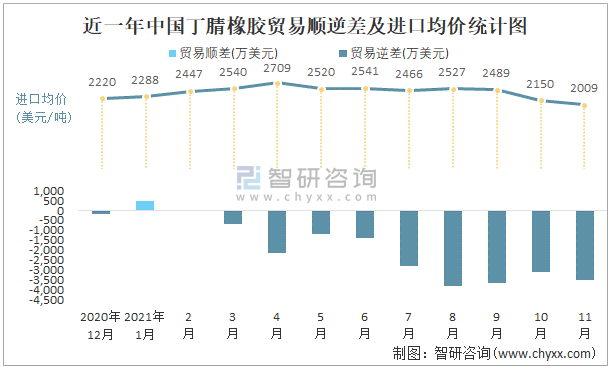 近一年中國丁腈橡膠順逆差及進(jìn)口均價(jià)統(tǒng)計(jì)圖