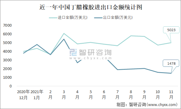 近一年中國丁腈橡膠進(jìn)出口金額統(tǒng)計(jì)圖
