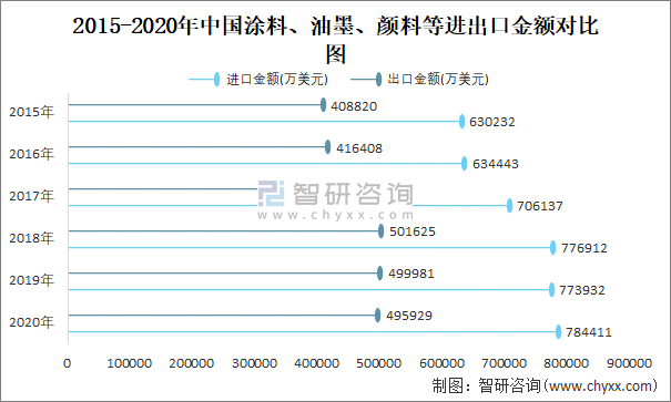 2015-2020年中國涂料、油墨、顏料等進出口金額對比統計圖