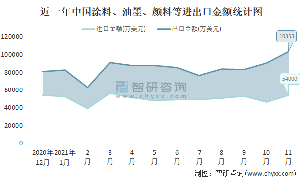 根據中國石油和化學工業聯合會數據顯示:2021年11月中國涂料、油墨、顏料等進口數量為7.4萬噸,出口數量為30.3萬噸;進口金額為54000萬美元,出口金額為103537萬美元;近一年中國涂料、油墨、顏料等出口總金額大于進口總金額,貿易順差為主,出口均價3417美元/噸。