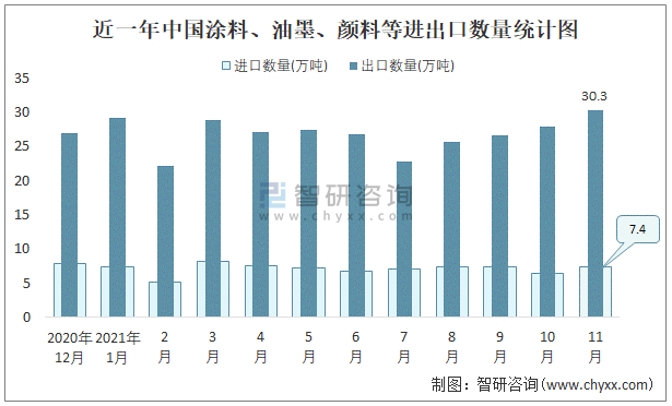 2021年11月中國涂料、油墨、顏料等進出口數量分別為7.4萬噸和30.3萬噸