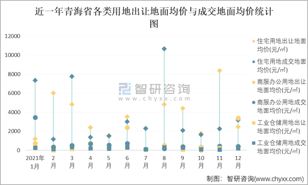 近一年青海省各類用地出讓地面均價與成交地面均價統計圖