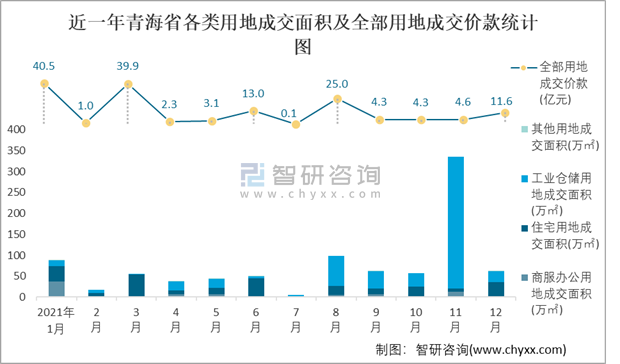 近一年青海省各類用地成交面積及全部用地成交價款統計圖