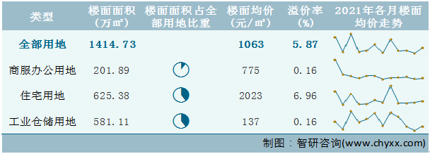 根據國信房地產信息網數據統計可知:2021年12月青海省全部用地出讓地面均價為1037元/㎡,其中商服辦公用地出讓地面均價最高(3405元/㎡),全部用地成交地面均價為1849元/㎡,其中住宅用地成交地面均價為3169元/㎡,高于商服辦公用地成交地面均價;2021年1-12月青海省住宅用地樓面面積占其全部用地比重最多,為44.2%,溢價率為6.96%。
