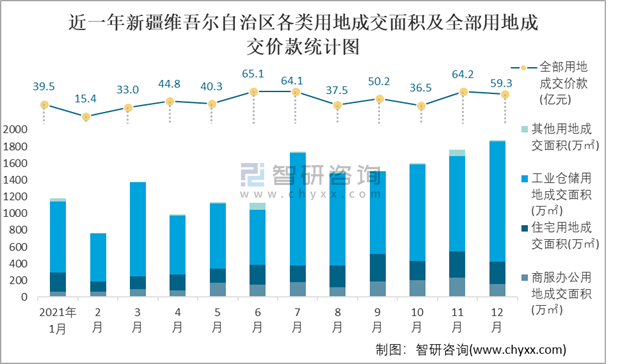近一年新疆維吾爾自治區(qū)各類(lèi)用地成交面積及全部用地成交價(jià)款統(tǒng)計(jì)圖