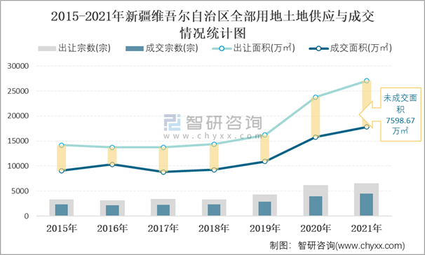 2015-2021年新疆維吾爾自治區(qū)全部用地土地供應(yīng)與成交情況統(tǒng)計(jì)圖