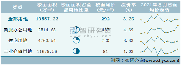 根據(jù)國(guó)信房地產(chǎn)信息網(wǎng)數(shù)據(jù)統(tǒng)計(jì)可知:2021年12月新疆維吾爾自治區(qū)全部用地出讓地面均價(jià)為358元/㎡,其中住宅用地出讓地面均價(jià)最高(1091元/㎡),全部用地成交地面均價(jià)為316元/㎡,其中住宅用地成交地面均價(jià)為1106元/㎡,高于商服辦公用地成交地面均價(jià);2021年1-12月新疆維吾爾自治區(qū)工業(yè)倉(cāng)儲(chǔ)用地樓面面積占其全部用地比重最多,為59.72%,溢價(jià)率為1.03%。