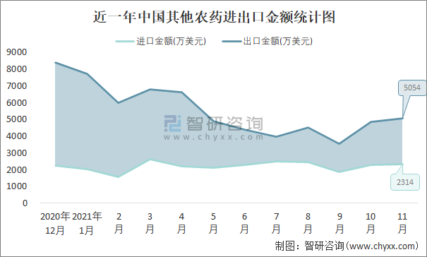 根據中國石油和化學工業聯合會數據顯示:2021年11月中國其他農藥進口數量為0.4萬噸,出口數量為1.9萬噸;進口金額為2314萬美元,出口金額為5054萬美元;近一年中國其他農藥出口總金額大于進口總金額,貿易順差為主,出口均價2660美元/噸。