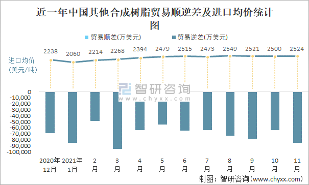 近一年中國其他合成樹脂順逆差及進口均價統計圖