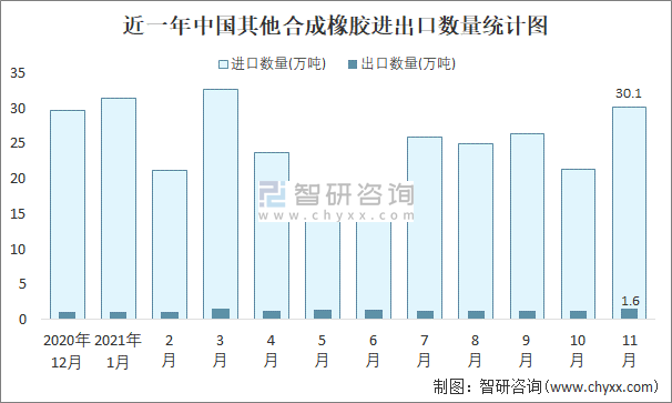 根據(jù)中國石油和化學(xué)工業(yè)聯(lián)合會(huì)數(shù)據(jù)顯示:2021年11月中國其他合成橡膠進(jìn)口數(shù)量為30.1萬噸,出口數(shù)量為1.6萬噸;進(jìn)口金額為52639萬美元,出口金額為4497萬美元;近一年中國其他合成橡膠出口總金額小于進(jìn)口總金額,貿(mào)易逆差為主,進(jìn)口均價(jià)1749美元/噸。