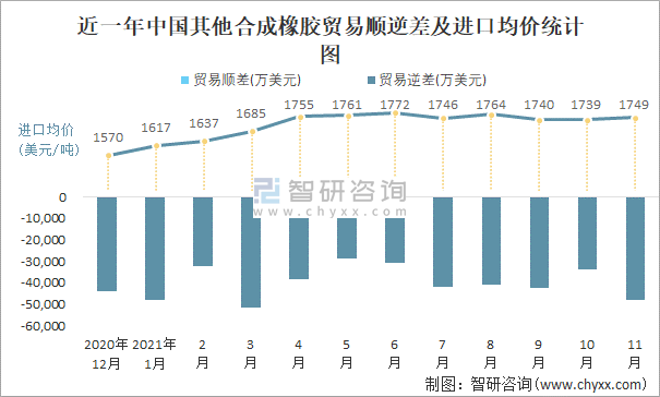 近一年中國其他合成橡膠順逆差及進(jìn)口均價(jià)統(tǒng)計(jì)圖