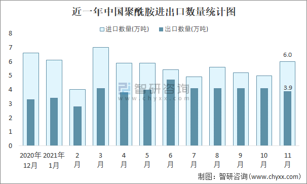 2021年11月中國聚酰胺進出口數量分別為6萬噸和3.9萬噸