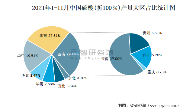 2021年1-11月中國硫酸(折100%)產量為8556萬噸 西南地區產量最高(占比28.4%)