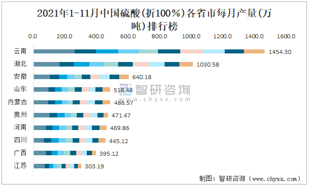 2021年1-11月中國硫酸(折100%)各省市每月產量排行榜