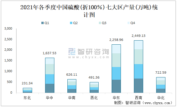 2021年各季度中國硫酸(折100%)七大區產量統計圖