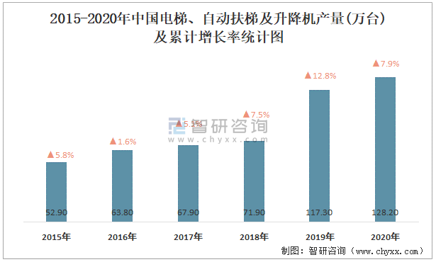 2015-2020年中國電梯、自動扶梯及升降機產量及累計增長率統計圖