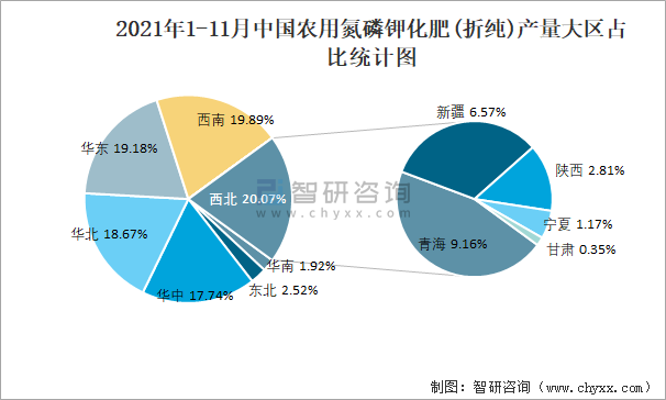 2021年1-11月中國農用氮磷鉀化肥(折純)產量大區占比統計圖