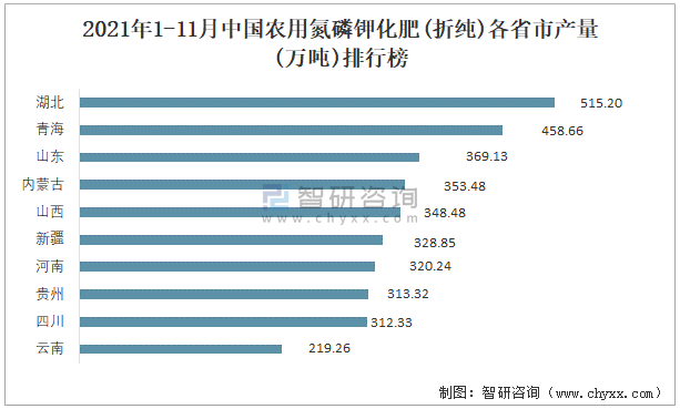 2021年1-11月中國農用氮磷鉀化肥(折純)各省市產量排行榜