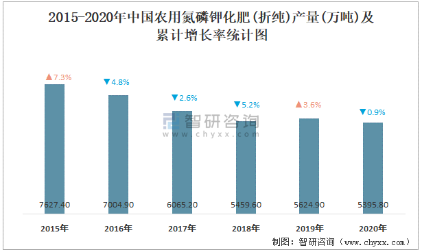 2015-2020年中國農用氮磷鉀化肥(折純)產量及累計增長率統計圖