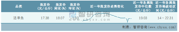 根據(jù)農(nóng)村農(nóng)業(yè)部數(shù)據(jù)統(tǒng)計(jì)可知:2022年第4周全國(guó)活草魚平均批發(fā)價(jià)為17.38元/公斤,同比增加18.07%,環(huán)比下跌1.03%,近一年全國(guó)活草魚平均批發(fā)價(jià)最高達(dá)到22.31元/公斤,批發(fā)價(jià)最低也要14元/公斤。