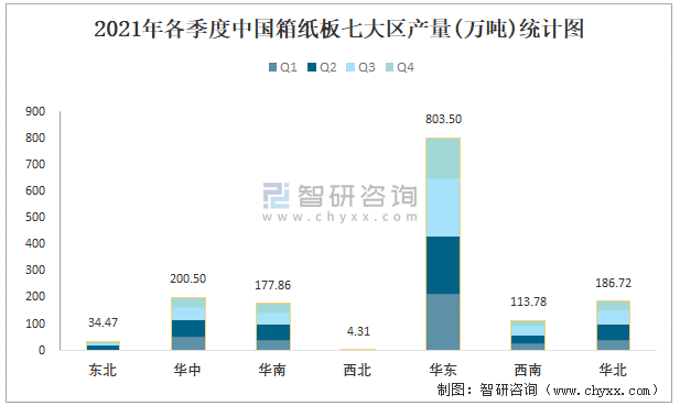 2021年各季度中國箱紙板七大區產量統計圖