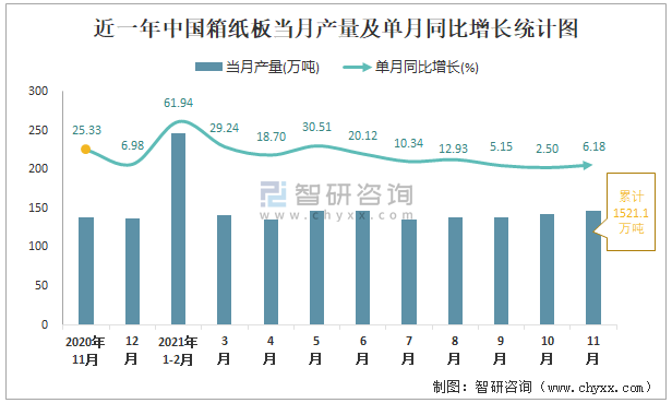 根據國家統計局數據顯示:2021年11月中國箱紙板產量為146萬噸,同比增長6.18%;2021年1-11月中國箱紙板累計產量為1521.1萬噸,同比增長21.44%;2015-2020年中國箱紙板產量總體呈現上升趨勢,2020年達到最大。